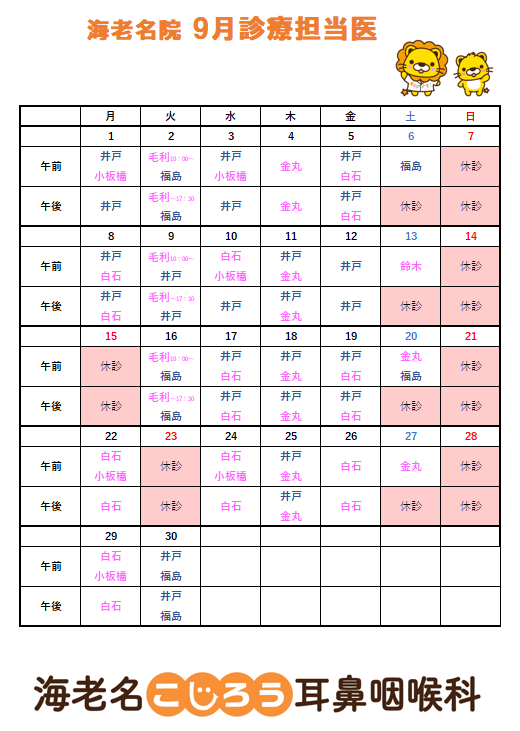 9月の診療担当医(海老名院) ※9/12 修正版 2025.08.22 海老名院 9月の海老名院診療担当医は下記の通りとなります。(9/12 修正しました) ご予約をお取りの上ご来院くださいますようお願いいたします。 月・水の午前のみ2診制となります!前の記事 9月の診療担当医~駅前院~次の記事