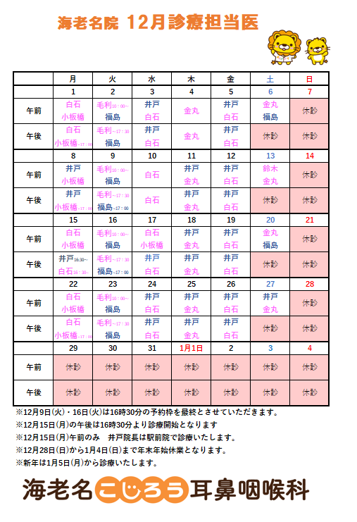 12月の診療担当医は下記の通りとなります。